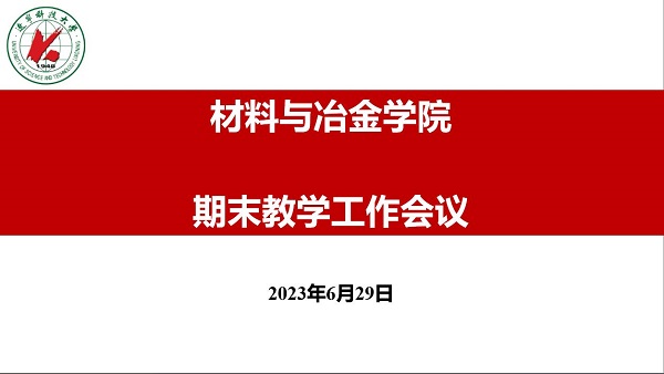 6月29日,材料与冶金学院2022-2023学年第二学期期末教学工作会议在材冶楼A241举行。学院副院长(主持工作)艾新港、副院长李雪、吕哲及各专业负责人、实验中心主任、学办主任参加会议。