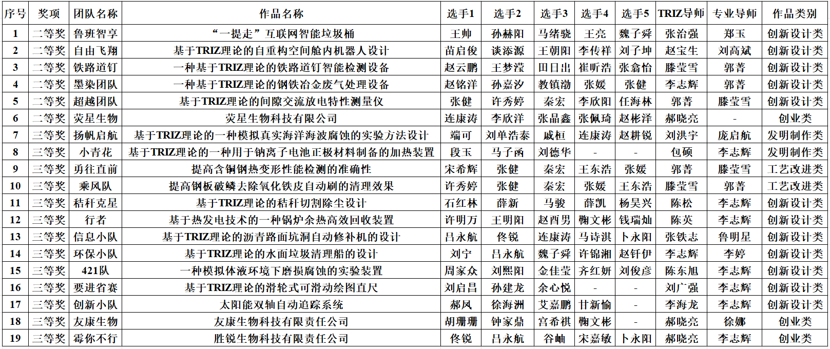 全省33所高校学生获奖作品合计470项,其中发明制作类93项、工艺改进类80项、创新设计类257项、创业类40项。辽科大获得19项,其中作品负责人本科生10项、研究生9项,来自材冶学院9项、化工学院3项、机械学院3项、土木学院3项、矿业学院1项。