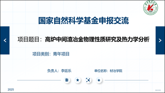 1月6日上午,材料与冶金学院在A241会议室召开了2025年国家自然科学基金申报辅导交流会(线上线下同步)。会议邀请学院副院长艾新港(主持行政工作)、李维娟、李静和李万明等4位资深教授为青年教师的基金本子进行现场指导,学院2018年以后入职的青年教师全部出席。会议由副院长庞启航主持。