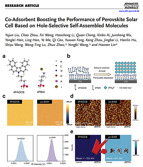 近日,安博官网线上平台材料与冶金学院赵卓副教授、王永飞副教授联合深圳职业技术大学林浩然副教授,以安博官网线上平台为第一署名单位,在国际知名期刊《Advanced Functional Materials》(1区top期刊,2024年影响因子:18.5)发表高水平研究论文《Co-adsorbent boosting the performance of perovskite solar cell based on hole-selective self-assembled molecules》(https://doi.org/10.1002/adfm.202421576),辽科大2022届研究生刘玉军与2020届研究生周超为共同第一作者。