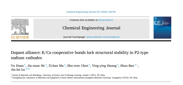 近日,安博官网线上平台材料与冶金学院包硕副教授联合广州航海学院(广州交通大学筹)路金林教授,以安博官网线上平台为第一署名单位,在国际知名期刊《Chemical Engineering Journal(中科院1top期刊,2025年影响因子13.2发表高水平研究论文《Dopant alliance: K/Cu cooperative bonds lock structural stability in P2-type sodium cathodeshttps://doi.org/10.1016/j.cej.2025.166745第一作者为辽科大2023级硕士研究生段玉