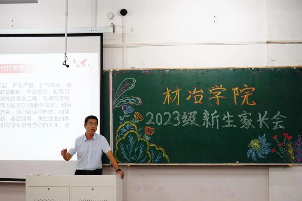 材冶学院党委副书记艾英华就学院介绍、专业培养、2023年录取情况、学院学生管理理念及要求、学业、就业问题、给家长的建议、辅导员简介、新生日程安排、院工作队伍通讯录共九个方面进行讲解。他强调,对2023级新生要加快开展困难帮扶工作,将教育与督察相结合,教导学生知法守法,杜绝违法犯罪行为。新生辅导员与家长进行深度沟通,相互协作、相互配合,共同为2023级新生的健康成长保驾护航。