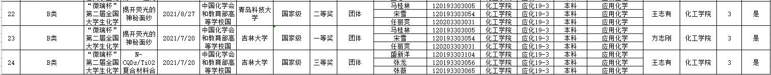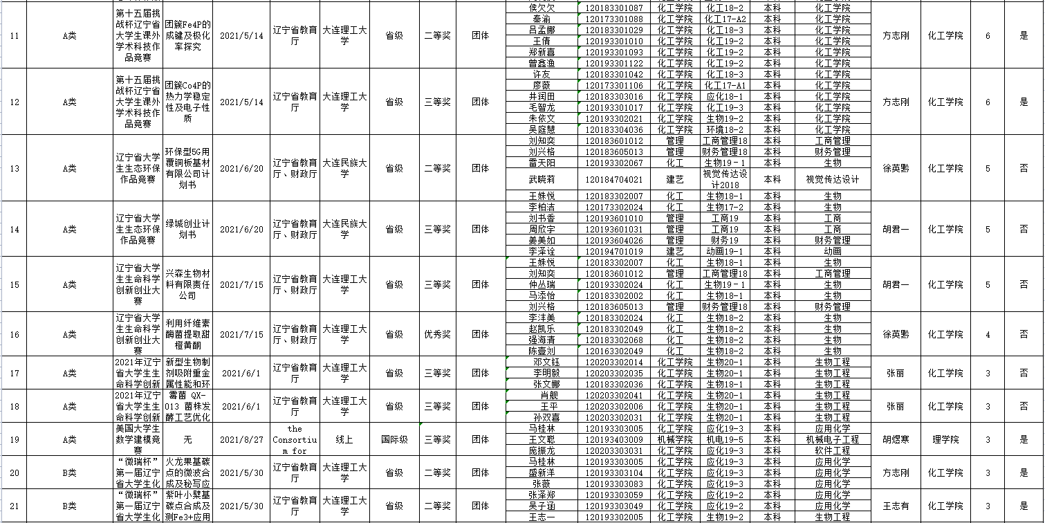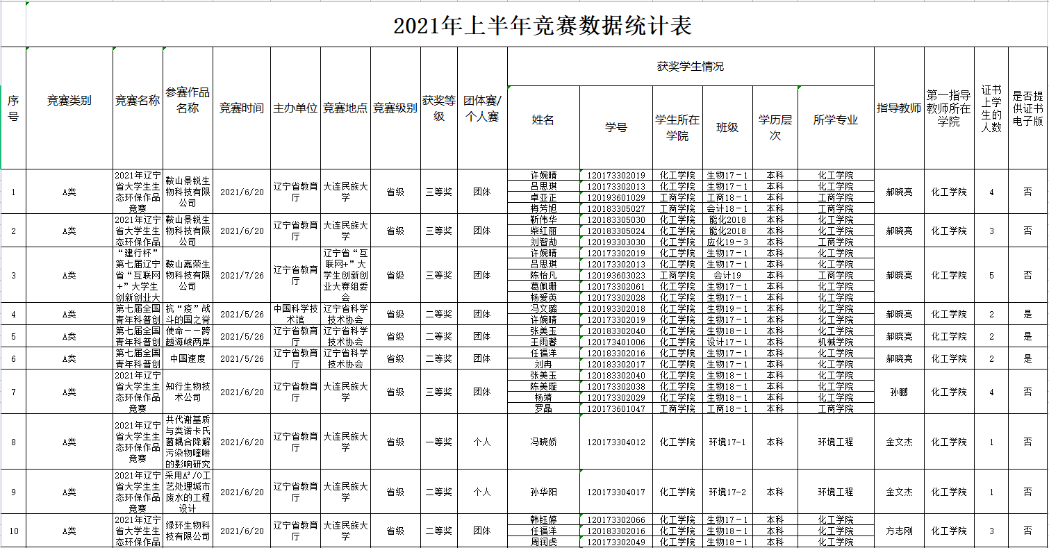 化工学院2021年上半年学生创新创业竞赛获奖情况统计表