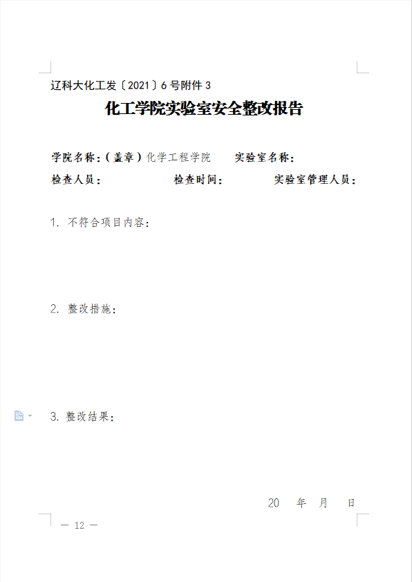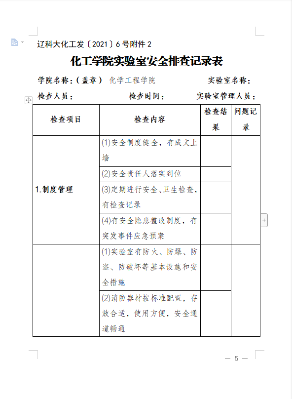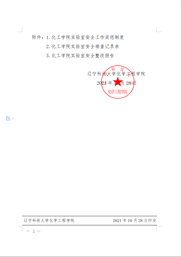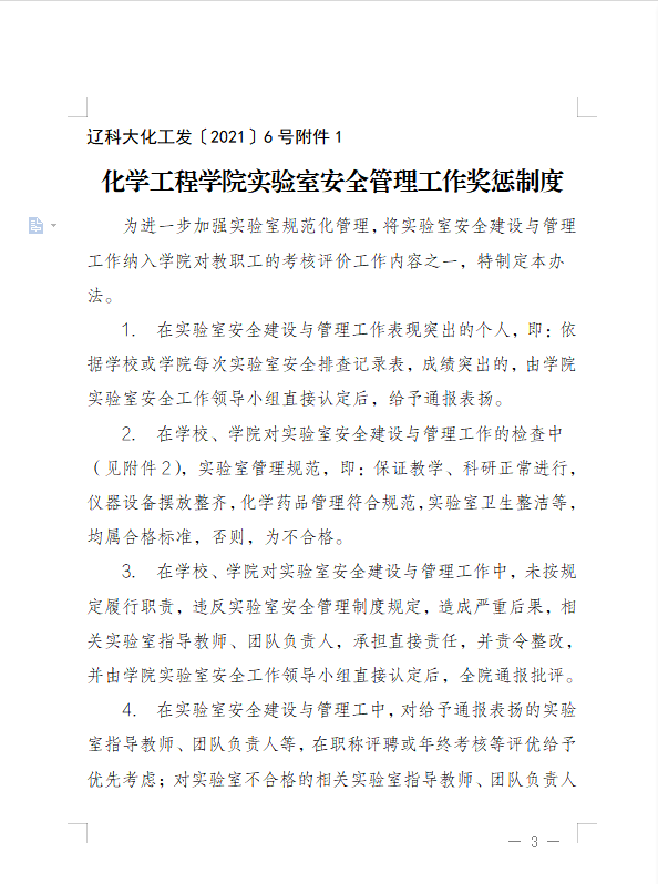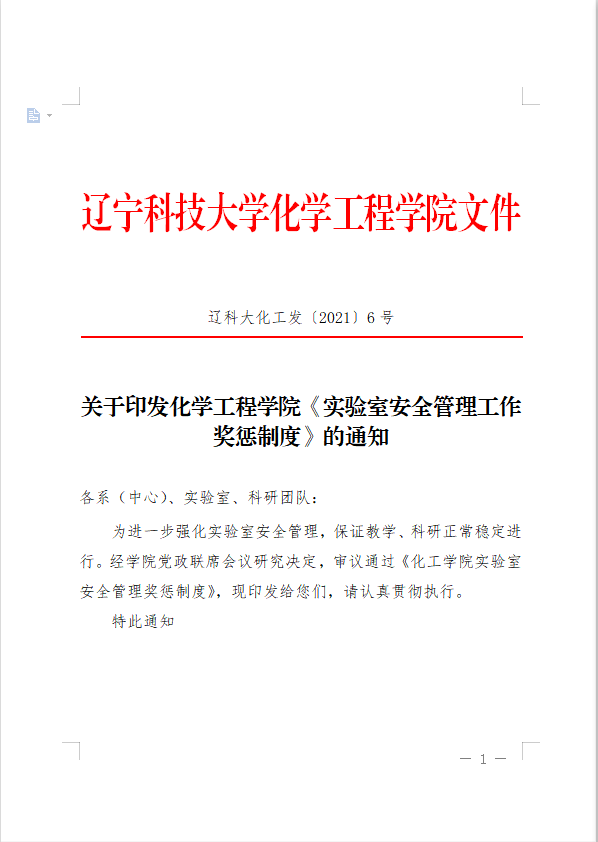 辽科大化工发〔2021〕6号 关于印发化学工程学院《化工学院实验室安全管理奖惩制度》的通知.doc