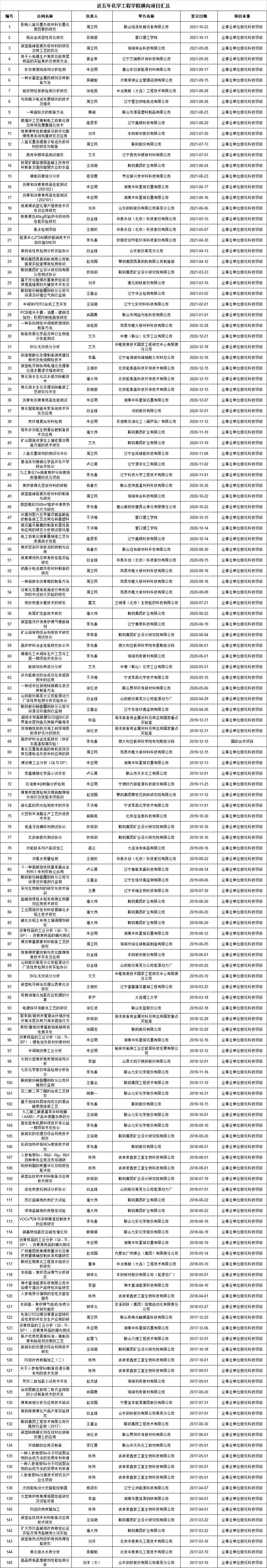 近五年化学工程学院横向项目汇总
