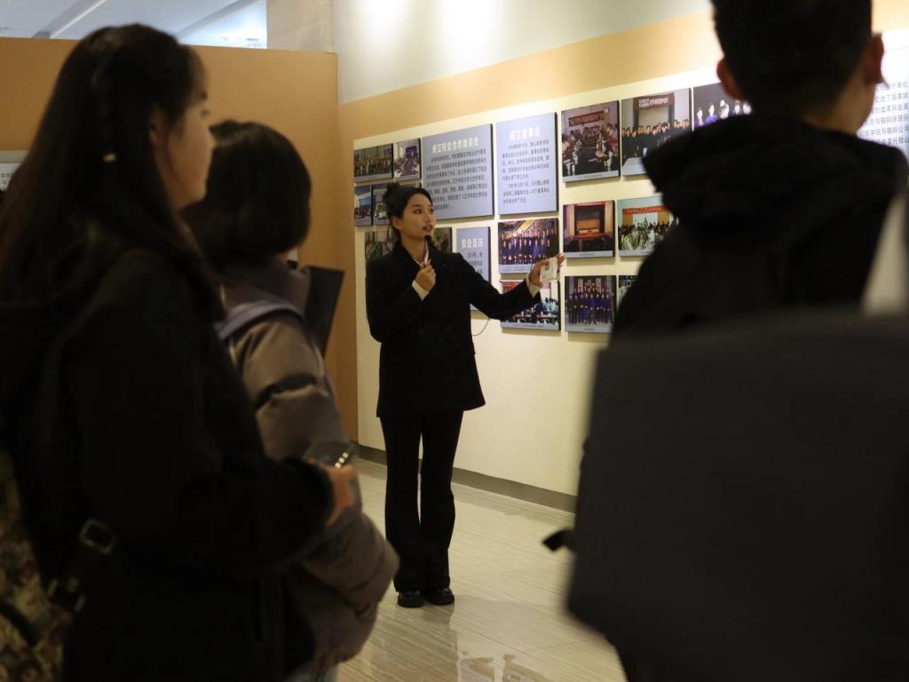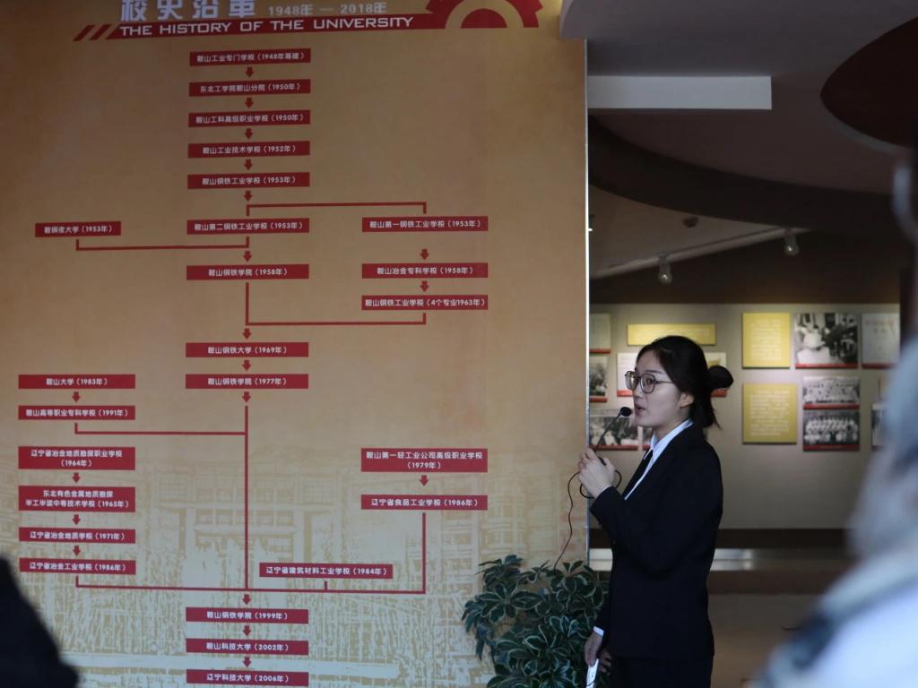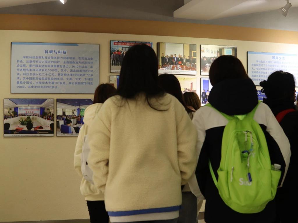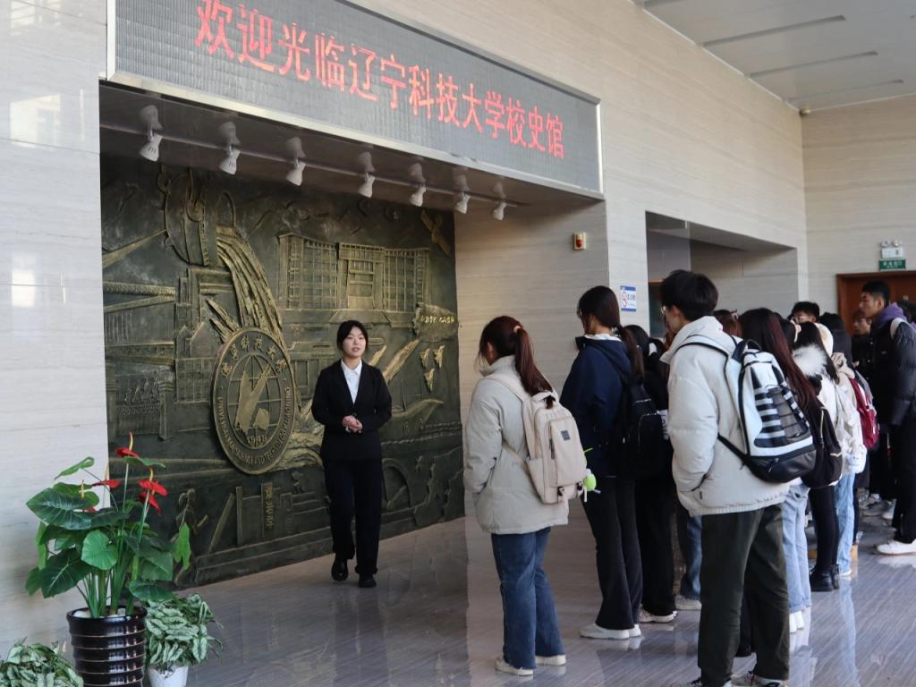 活动开始,在院学生会带领下全体2023级新生共唱校歌。随后,各新生班级依序在校史馆工作人员的讲解声下观看了学校展览。学校历史发展的时间清晰明了,伴随着讲解,同学们了解了我校悠久的办学历史、鲜明的办学特色和卓越的办学成就,对辽科大“博学明德,经世致用”校训有了更深的体悟。当看到“航空母舰使用的海工钢、高铁使用的钢轨、嫦娥五号卫星使用的光学仪器组件”等科技产品都有辽科大的身影时,同学们兴奋之情溢于言表,他们对我校硕果累累的育人史有了更深刻的认知。
