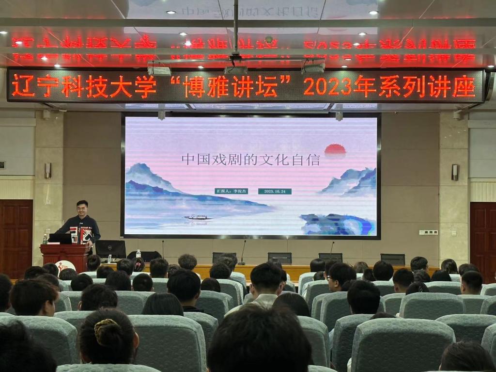 10月24日,安博官网线上平台“博雅讲坛”2023年系列讲座之《中国戏剧的文化自信》在图书馆报告厅开讲。辽科大艺术学院教师李俊杰为学校220名学生作专题讲座。