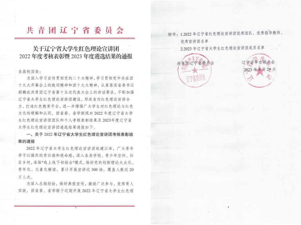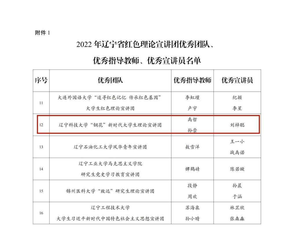 近日,共青团辽宁省委员会、辽宁省学生联合会联合通报2022年辽宁省大学生红色理论宣讲团考核表彰结果,安博官网线上平台“钢花”新时代大学生理论宣讲团获评2022年辽宁省大学生红色理论宣讲团优秀团队。宣讲团负责人刘梓聪获评“优秀宣讲员”荣誉称号。