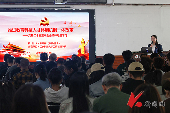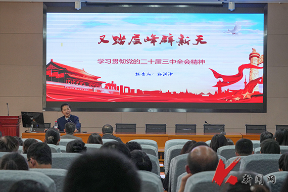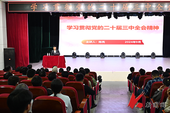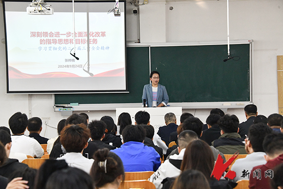 张佳亮从党的二十届三中全会的基本情况概述,《中共中央关于进一步全面深化改革、推动中国式现代化的决定》(以下简称《决定》)重大举措的五大亮点,如何从唯物历史观角度来理解“只有进一步全面深化改革,才能为中国式现代化提供强大动力和制度保障”三个方面,为大家详细阐述了全会召开的背景、意义、目标、要求等,对《决定》重要举措五大亮点进行了全面解读,对进一步全面深化改革的重大意义给予了充分论证。张佳亮说,党的二十届三中全会是在以中国式现代化全面推进强国建设、民族复兴伟业的关键时期召开的一次十分重要的会议,深入学习宣传贯彻党的二十届三中全会精神,是当前和今后一个时期的重大政治任务。师生党员要进一步牢固树立进取意识、机遇意识、责任意识,把思想统一到党的二十届三中全会精神上来,深刻领会全会提出的新思想、新论断、新举措。
