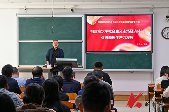 温馨以《构建高水平社会主义市场经济体制 促进新质生产力发展》为题作主题宣讲,他从基本框架与内涵逻辑、系统集成与重点突破、全面创新与一体实践三个方面,重点阐释了构建高水平市场经济与发展新质生产力的内核性的深刻内涵,具体分析了经济体制改革对各领域、各方面改革的重要影响和传导作用。他通过唯物史观社会基本矛盾运动原理的理论分析,特别是经济和发展理论创新的探索分析,推进中华民族伟大复兴所身处和面临的国内外环境的客观分析,教育科技人才对促进新质生产力发展的实际分析,阐释了新时代全面深化改革,推进中国式现代化的宏伟蓝图和美好愿景,加深了大家对全会精神的理解。