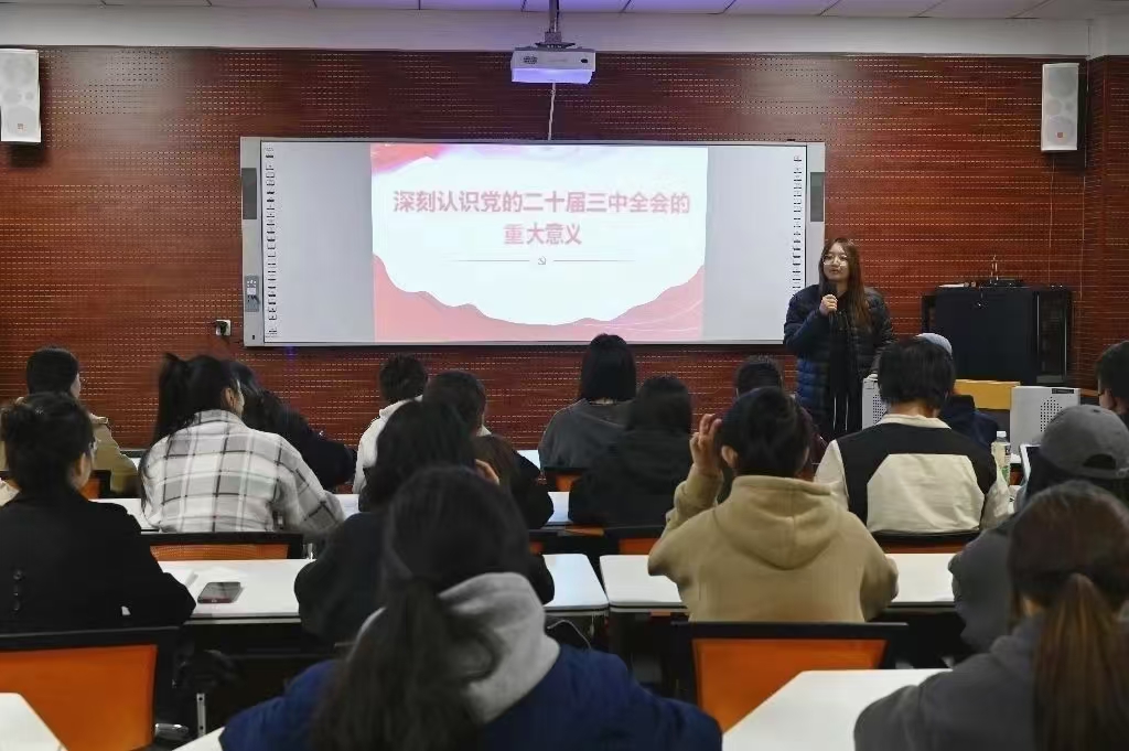 学院组织员王艺霏作党的二十届三中全会精神的主题宣讲。她为同学们介绍了全会精神内涵及全会对全面深化改革做出的重要部署。她强调“贯彻落实行动是检验学习成效的重要标准”这一关键观点,同时引导同学们把学习成果转化为具体行动,以更加坚定的决心、更加务实的举措,把全会精神落到实处,为实现中华民族伟大复兴的中国梦而努力奋斗。
