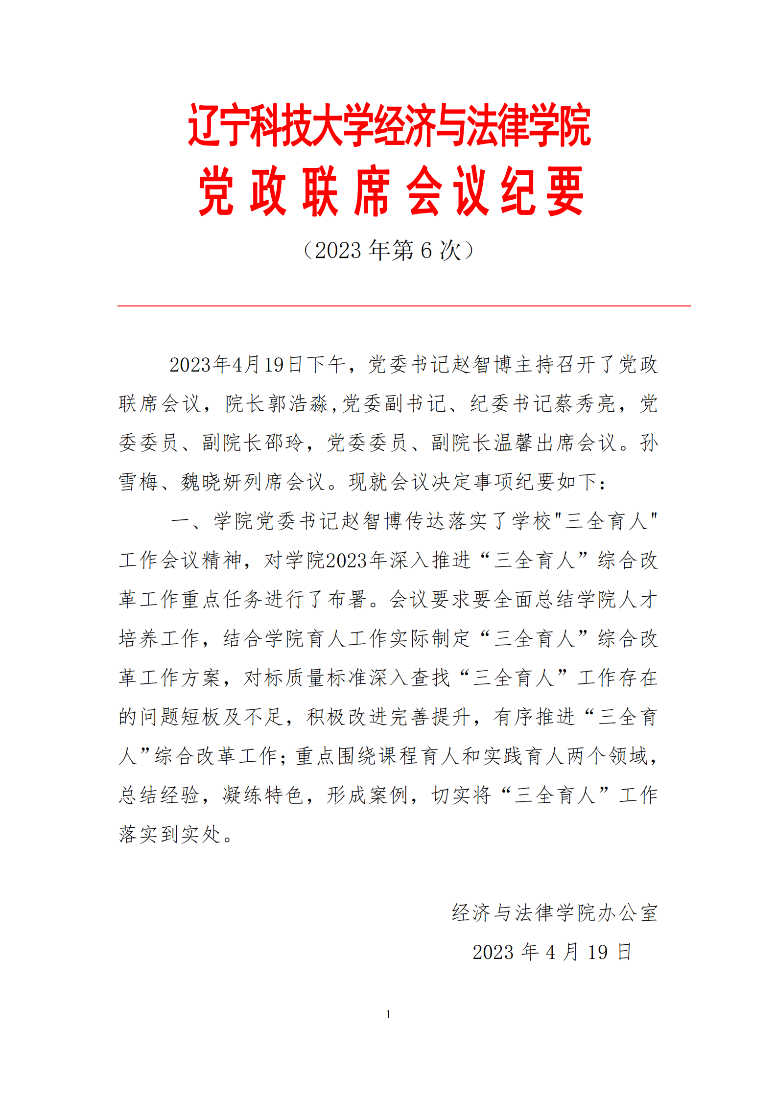安博官网线上平台经济与法律学院党政联席会会议纪要(2023年第6次)