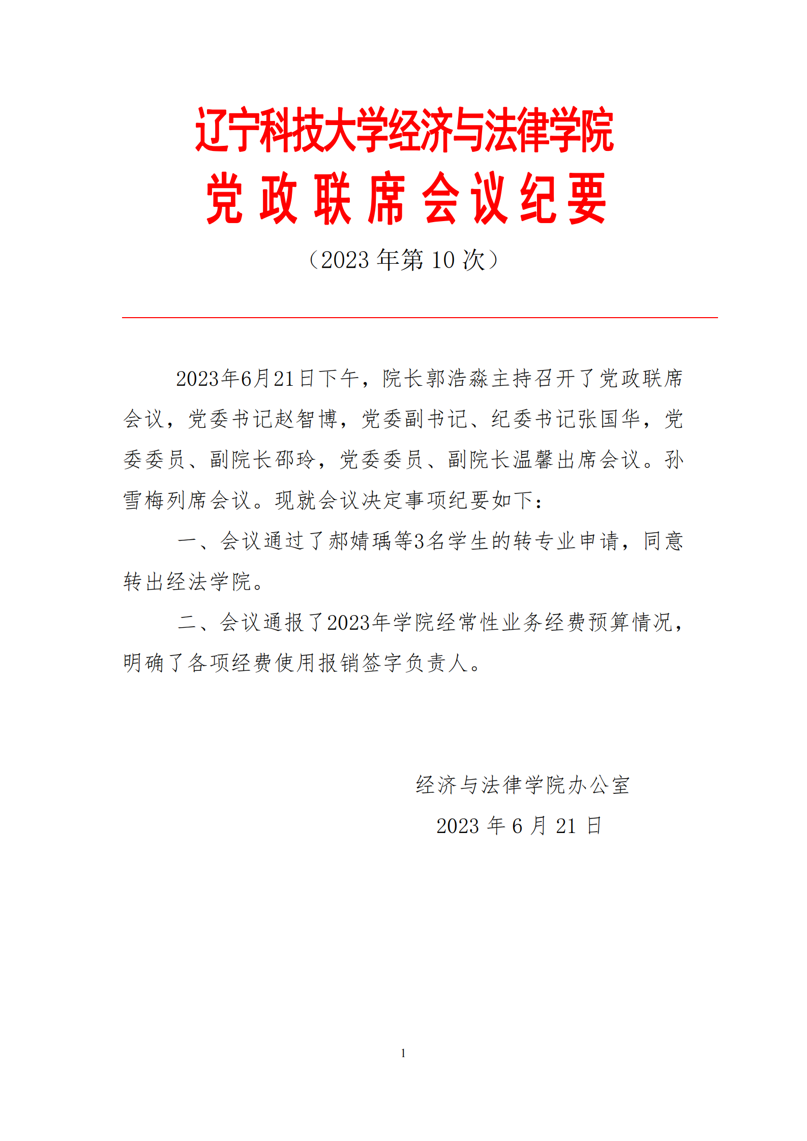 安博官网线上平台经济与法律学院党政联席会会议纪要(2023年第10次)