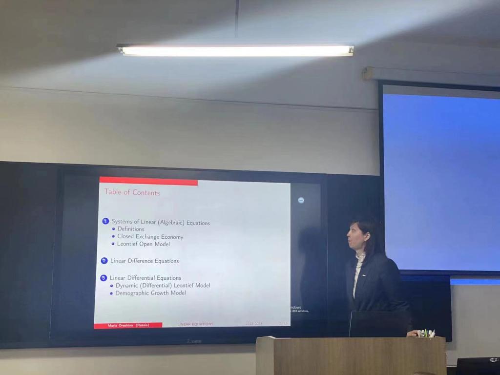 交流中,辽科大经法学院院长郭浩淼介绍了经法学院国际经济与贸易、金融和金融科技三个专业的发展现状、主要研究方向及近几年取得的主要研究成果。Галкин Александр Васильевич院长向经法学院师生介绍了俄罗斯利佩茨克州、利佩茨克国立技术大学的基本情况及如何运用EPR软件的核心算法来优化管理生产计划;Сысоев Антон Сергеевич副院长讲授了如何运用应用线性回归模型来描述社会经济系统的动态问题;Орешина Мария Николаевна主任介绍了代数方程组、微分和差分模型在经济分析中的应用。与会的经法学院师生与三位俄方教师就相互关心的学术问题进行了深入的交流互动。