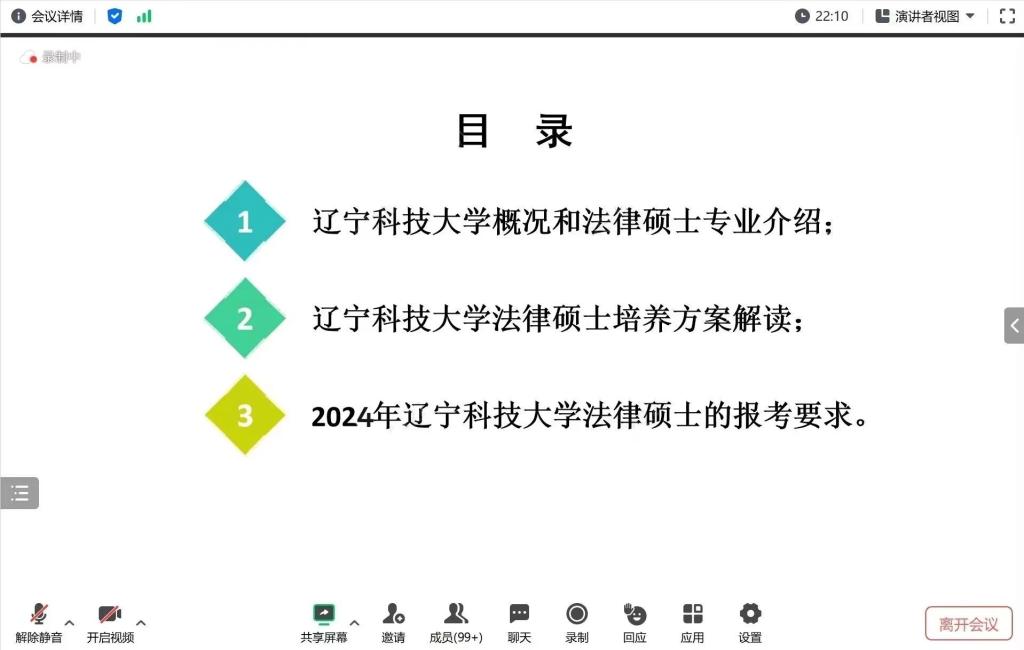 本次线上招生宣讲会的成功召开使学生们对辽科大经法学院有了更深入的了解。经法学院近年来不断加强学科建设,在教学和科研方面加大投入,使得法硕培养方案更加完善,更加符合社会实际需求,未来经法学院将继续坚持高质量发展,努力培养高水平应用型法律专业人才。