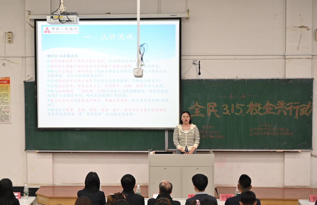 活动伊始,中国人民银行鞍山分行副行长刘纪首先致辞,随后由东方财富证券鞍山营业部工作人员姜英东作《走进基金的世界,开启我的第一堂基金课》主题宣讲。中国人民银行科员韩玮为同学们普及了反洗钱常识及对应的公民义务,带领大家了解到什么是洗钱、洗钱相关法律法规、洗钱的危害以及反洗钱监管体制等,并通过洗钱案例警示大家远离洗钱,勇于举报洗钱活动。随后易方达基金公司代表向同学们介绍了基金从业和职业生涯规划等方面的内容,并从自身出发,分享职业经历,让同学们对基金运行和基金市场产生了更直观、更深入的认识。讲解过后,同学们针对当前基金环境和未来发展方向提出了自己的困惑和想法,代表们给予了耐心且详细的解答。最后,学院党委书记赵智博作总结发言,他首先对各企方代表的到来表达了感谢,宣布由东方财富证券鞍山营业部携手安博官网线上平台经法学院举办的第一届“全民3.15,校企共行动”活动正式开启,并表示此次活动在指导大学生就业实践方面具有重要意义,鼓励同学们积极参与其中,同时期待未来校企继续携手与时俱进,协同育人,实现双向奔赴。