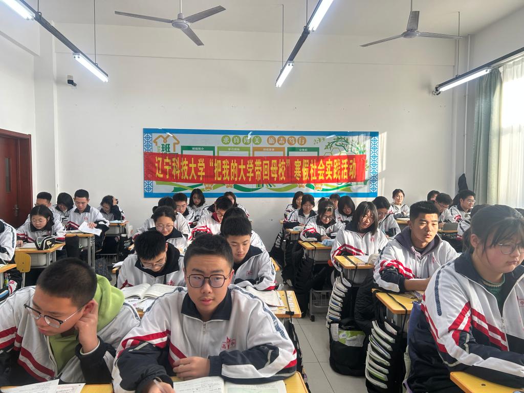 1月9日-1月16日,田磊、周缘、高源、周欣雨、李欣5名团队成员分别前往大洼高级中学、黑龙江省哈尔滨市双城区铁路中学以及昌图县第一高级中学,进行“把我的大学带回母校”寒假社会实践活动。
