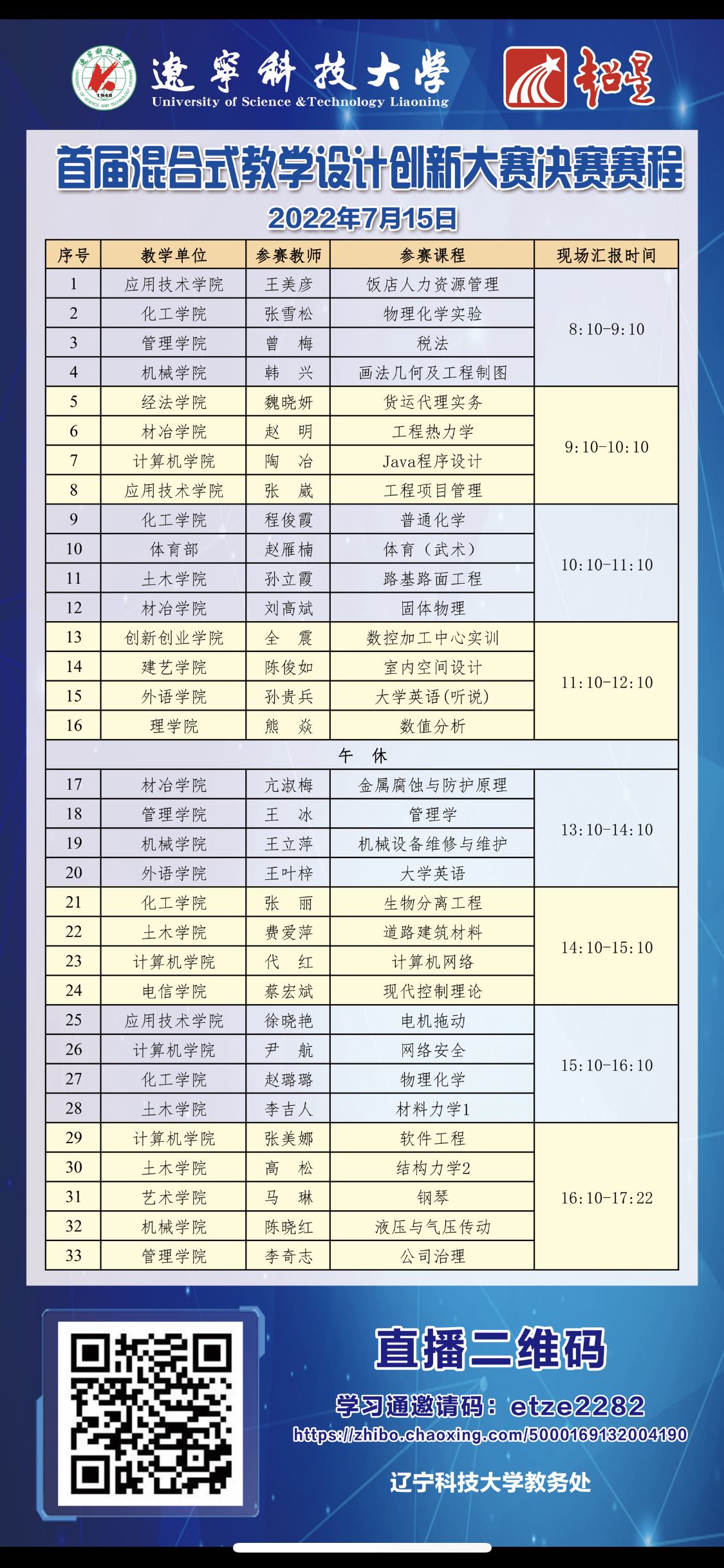 为深化信息技术与教育教学的融合,以混合式教学设计创新促进教师信息化教学能力提升。根据《关于组织开展第四届全国高校混合式教学设计创新大赛校赛的通知》(辽科大教发〔2022〕70号)要求,现就大赛决赛相关事宜通知如下:
