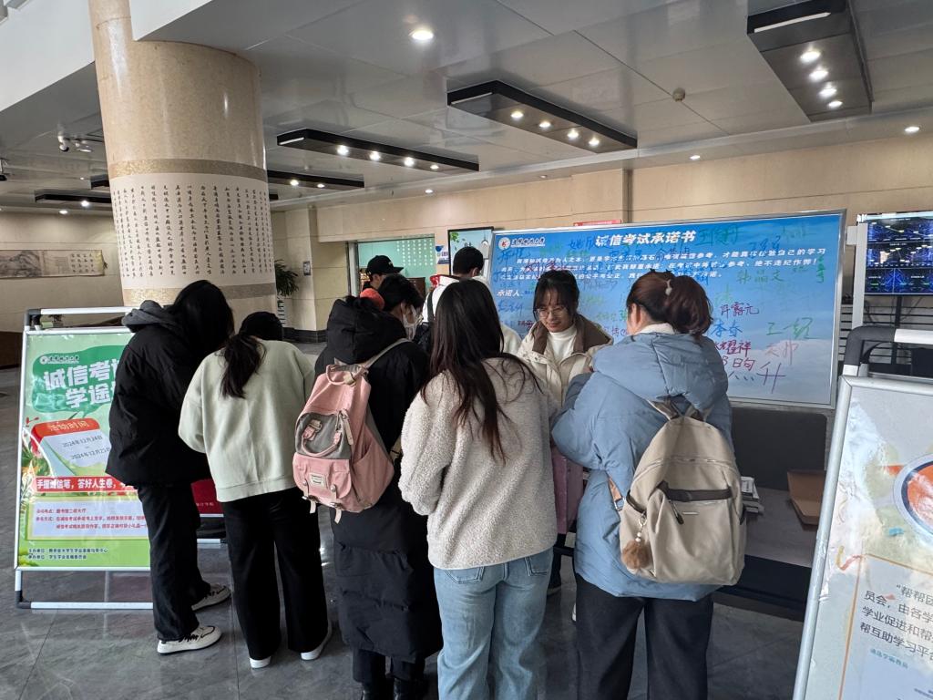 12月24日至12月25日,由教务处大学生学业发展指导中心主办、学生学业发展委员会承办的“诚信考试,学途坦行”主题活动于图书馆二楼大厅举行,活动吸引了1000余人参与。活动旨在通过趣味多元的形式,向同学们深入传递诚信考试的重要理念,助力营造良好的校园考试风气。