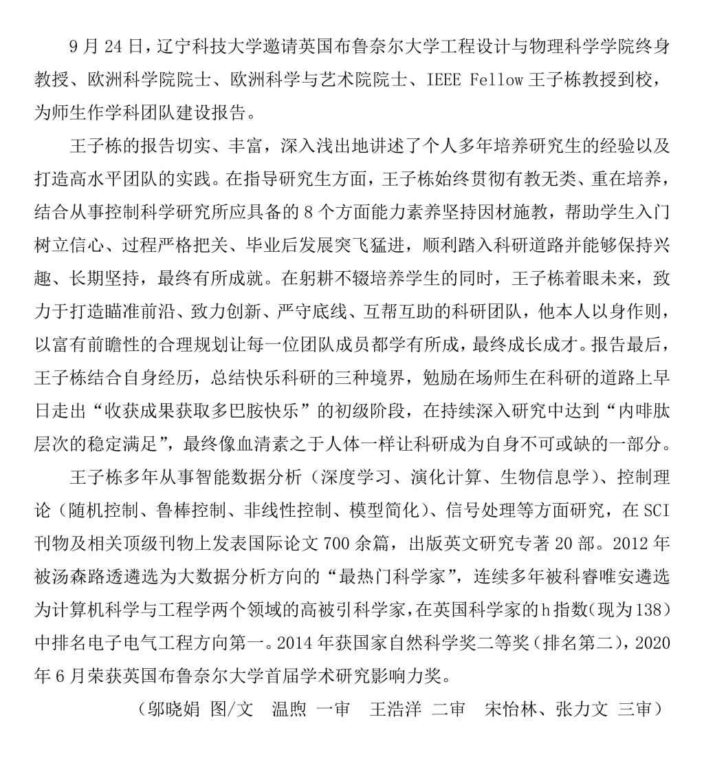 辽科大邀请王子栋院士作学科团队建设报告