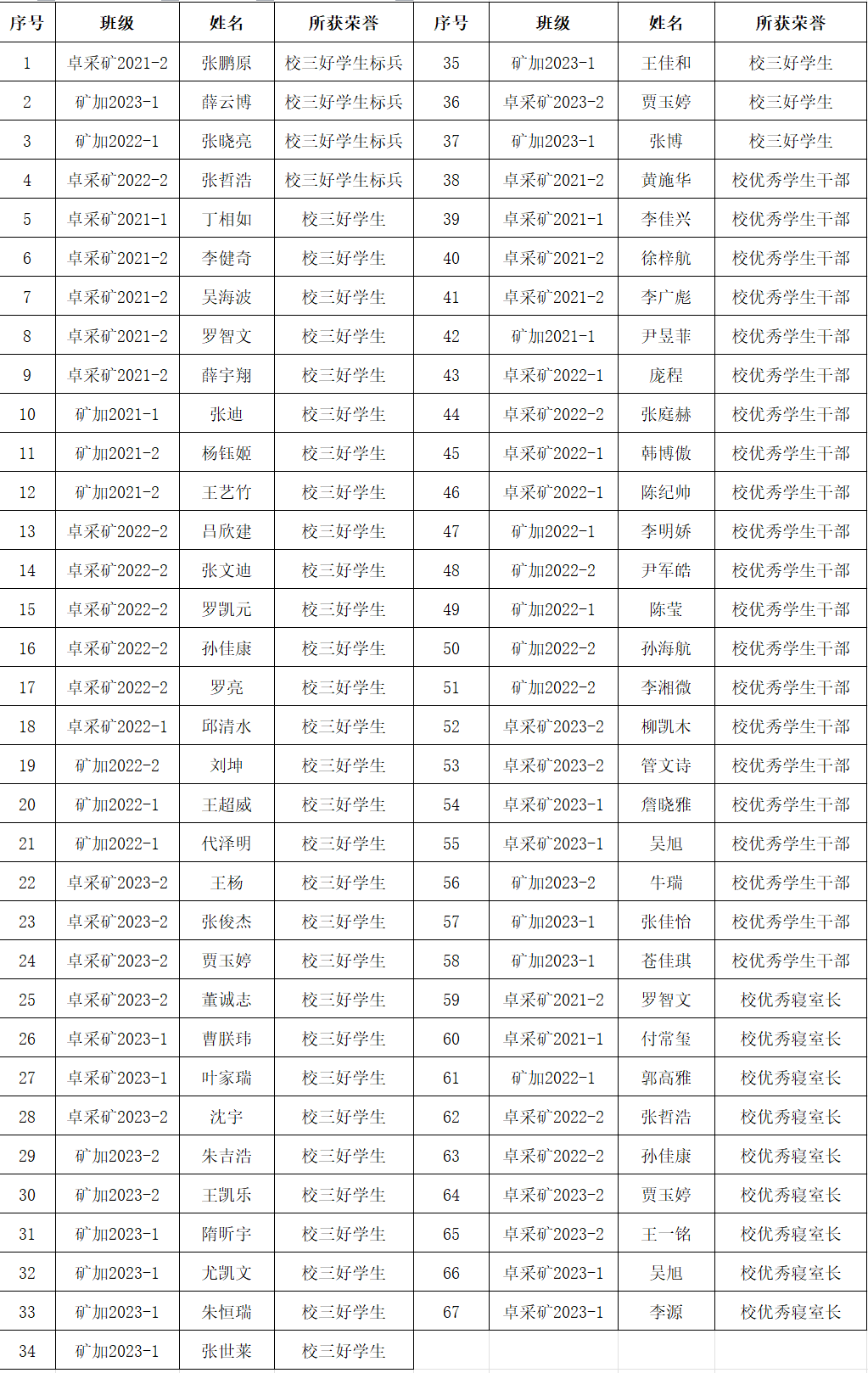 优良学风寝室:5-319(采矿22.2)、5-315(采矿22.2)、8-206(卓采矿23.2)、5-517(采矿21.2)