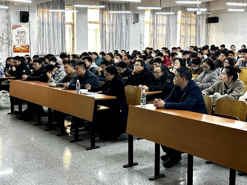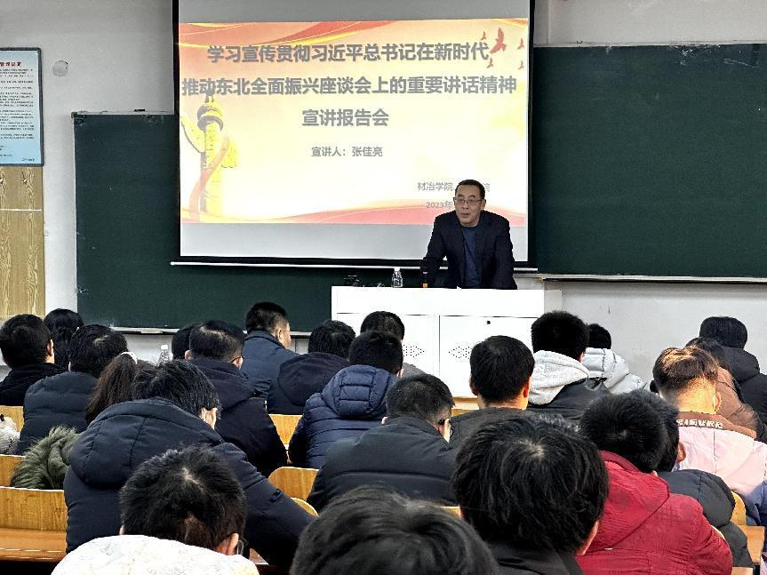 为巩固学习贯彻习近平新时代中国特色社会主义思想主题教育成果,学习宣传贯彻习近平总书记在新时代推动东北全面振兴座谈会上的重要讲话精神,引导广大师生切实把习近平总书记重要讲话精神转化为加快高质量发展的思路举措、履职尽责的实际行动,根据学校党委的统一部署,12月5日下午,校理论宣讲团专题宣讲报告会在博学楼C310举行,会议由理学院党委书记张春霞主持,校党委常委、宣传部部长张佳亮教授作主题为《学习宣传贯彻习近平总书记在新时代推动东北全面振兴座谈会上的重要讲话精神》的宣讲报告,材冶学院、理学院班子成员、党员、党派人士和师生代表参加报告会。