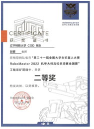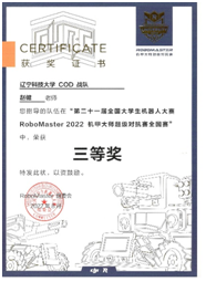 6月25日-27日第二十一届全国大学生机器人大赛RoboMaster 2022机甲大师超级对抗赛东部赛区赛在江苏省常州市武进体育馆举行。我校COD战队获得了东部赛区二等奖、全国三等奖,其中步兵机器人、工程采矿机器人获东部赛区一等奖,全国二等奖。