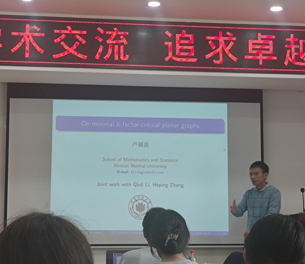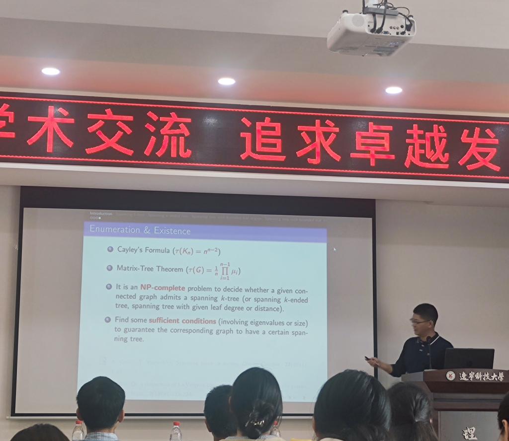 第一位报告人是李建喜教授,他主要讨论了图中几种生成树的存在性,并给出了保证相应图具有一定生成树的几个充分条件(包括特征值和大小)。生成树在许多领域都具有广泛的应用,可以帮助解决实际问题,优化资源利用和决策制定。第二位报告人是卢福良教授,他重点讨论关于生成树和完美匹配的图论问题。他发现一种特殊类型的图,称为k因子临界图,并证实了平面图形的猜想。第三位报告人是徐守军教授,他证明了置换集合中的Cayley图具有高度可扩展性,并提出了验证方法,为图论和组合数学领域的深入研究提供了新的视角和工具。