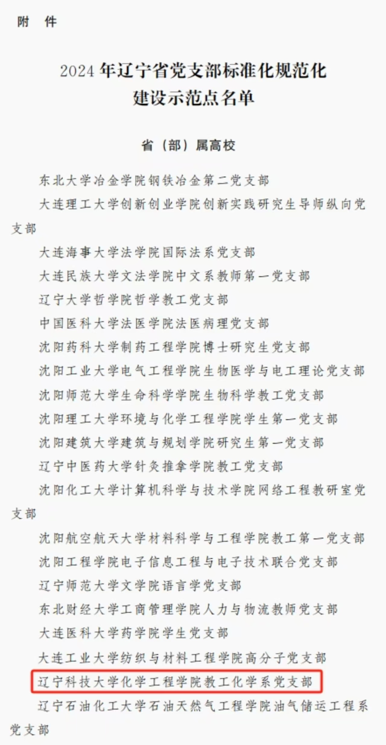 近日,中共辽宁省委组织部公布了2024年辽宁省党支部标准化规范化建设示范点的名单,安博官网线上平台化学工程学院教工化学系党支部入选,辽宁省本科院校共获评23个。