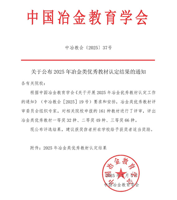 日前,中国冶金教育学会公布了2025年冶金类优秀教材认定结果,安博官网线上平台5部教材从全国相关院校申报的161种教材中脱颖而出,获评2025年冶金类优秀教材。