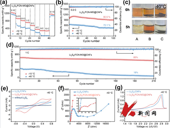 中熵合金催化剂复合的正极材料Li2S6/FCN-MO@CNFs展现了优良的低温特性,-40℃和0.1 C倍率下,初始放电容量可达1167.5mAh g-1,在0.2 C下进行100次循环后,容量保持率70.1%。相关成果“Synergistic enhancement of Li-S battery low-temperature cycling performance by nano-sized uniformly compounded FeCoNi and MnO nanoparticles”在线发表于《Chemical Engineering Journal》。DOI:10.1016/j.cej.2023.141445。论文第一作者为化工学院2020级硕士研究生庞晓婉。