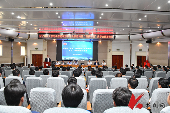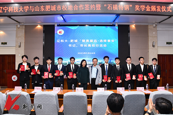 会上,辽科大校友、石横特钢技术副总王长生进行企业推介;肥城市为聘请的辽科大党委研究生工作部部长李激光、材料与冶金学院党委副书记艾英华颁发“校园引才大使”证书;山东鲁岳化工公司为聘请的人力资源副总、辽科大化学工程学院党委副书记蔡秀亮颁发聘书;石横特钢领导为辽科大20名获得“石横特钢”奖学金的学生颁发了获奖证书和奖学金。全体与会的肥城市来宾共同参观了辽科大冶炼-轧制综合实验大厅、镁质材料展厅、材料分析检测中心和表面工程实验室。
