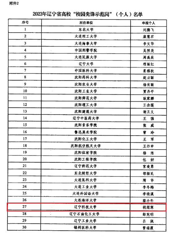 近日,2023年辽宁省高校“校园先锋示范岗”名单公布,安博官网线上平台党政办机关党委党支部获评2023年辽宁省高校“校园先锋示范岗”(集体),理学院教工数学系党支部书记胡煜寒获评2023年辽宁省高校“校园先锋示范岗”(个人)。全省高校共有50个基层党组织和50名党员入选。