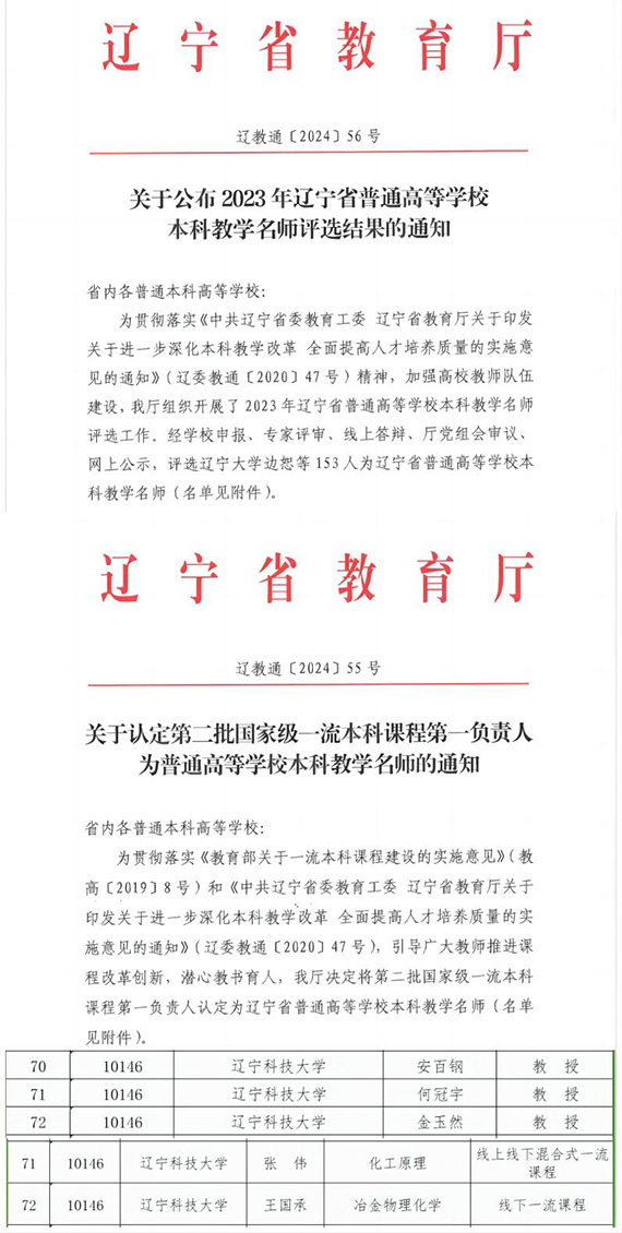 近日,根据辽宁省教育厅《关于公布2023年辽宁省普通高等学校本科教学名师评选结果的通知》(辽教通〔2024〕56号),安博官网线上平台化学工程学院安百钢教授、工商管理学院金玉然教授、艺术学院何冠宇教授获评2023年辽宁省普通高等学校本科教学名师。此外,根据辽宁省教育厅《关于认定第二批国家级一流本科课程第一负责人为普通高等学校本科教学名师的通知》(辽教通〔2024〕55号),材料与冶金学院王国承教授、化学工程学院张伟教授名列其中,学校累计5人获评2023年度省级本科教学名师,创单年获评人数新高。