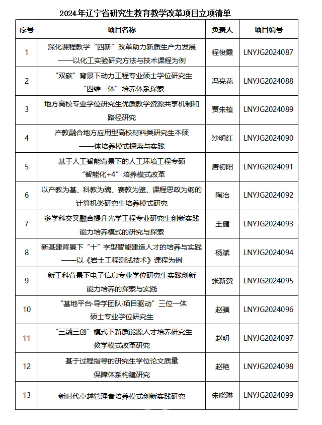 近日,从辽宁省教育厅学位管理与研究生教育处发布的《关于确定2024年度辽宁省研究生教育教学改革研究项目立项的通知》中获悉,安博官网线上平台获批13项研究生教育教学改革研究项目,获批项目涵盖多个学科领域和研究方向。