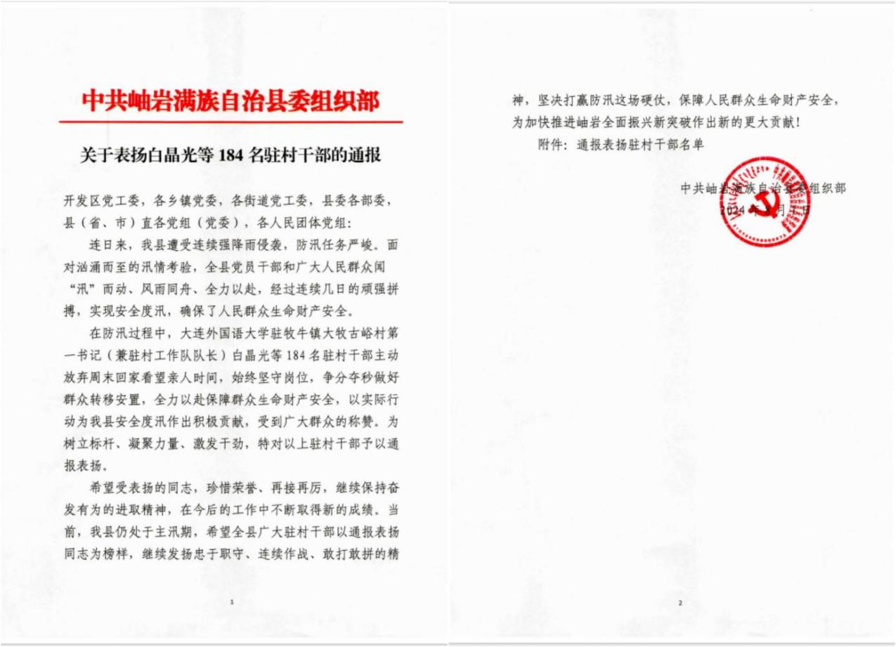 近期,安博官网线上平台党委选派到岫岩县的驻村干部刘洋、赵辉、郭奎权、周彬、姜丹、黄哲因在岫岩县防汛过程中表现突出,受到中共岫岩满族自治县委组织部通报表扬。