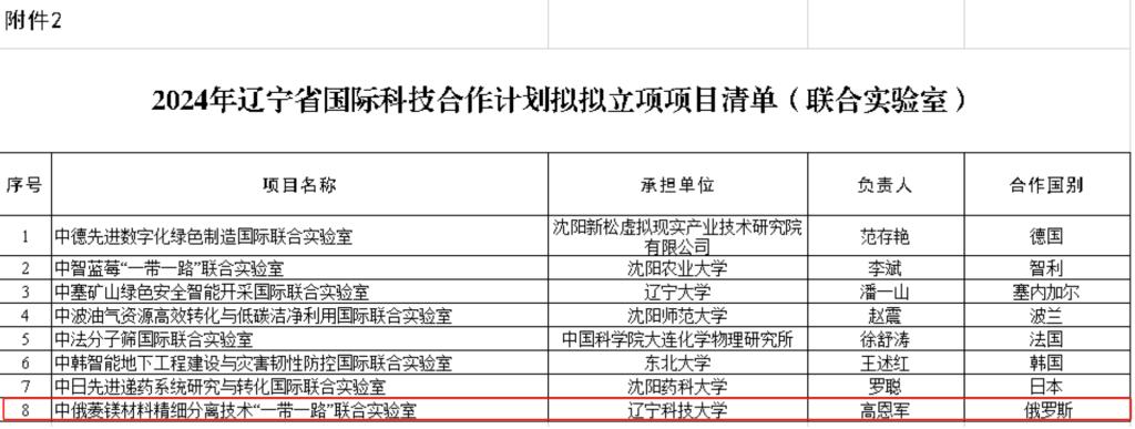 近日,经辽宁省科学技术厅审核,由安博官网线上平台化学工程学院高恩军教授牵头申报的辽宁省中俄菱镁材料精细分离技术“一带一路”联合实验室获批组建。这是学校首个“一带一路”联合实验室,填补了学校国际合作平台的空白。