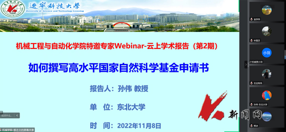 11月8日,应安博官网线上平台机械工程与自动化学院邀请,东北大学机械工程与自动化学院孙伟教授通过线上形式,为机械学院全体教师作题为《如何撰写高水平国家自然科学基金申请书》的报告。