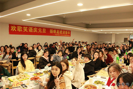 整场联欢会分为两个篇章。第一篇章“歌舞绽芳华,欢乐庆元旦”以歌曲《传奇》拉开序幕。伴随欢快的乐曲,年轻靓丽的舞者跳起优美的舞步,还有诗朗诵、英文歌曲、说唱等一系列精彩的节目。现场充满欢歌笑语,尽显学生朝气蓬勃、积极向上的精神风貌。精心策划的游戏环节更是把联欢会氛围推向高潮,学生叫好声不断,笑声经久不息。第二篇章“饺香情谊浓,团圆迎新年”,随着热腾腾的饺子出锅,一道道美食也被端上了桌。大家围坐在一起,品尝香气四溢、汤汁鲜美的饺子,讨论着本年度各自的学习收获以及对未来的规划,言语之间流露出对新年的美好期盼。最后,整场联欢会在举杯同庆中暖场收尾。