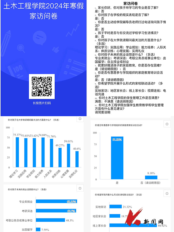寒假期间,安博官网线上平台土木工程学院多措并举、立体组网,持续推进家校联动工作,充分发挥学院领导班子成员、班主任(学业指导教师)、辅导员的积极性、主动性和创造性,灵活选取实地走访、网络家访和电话交流等形式,结合各年级学生特点和成长实际分别召开家长会,并围绕课业评估、关注热点、就业指导、满意度测评等内容开展问卷调查,依托精准的数据支撑和贴切的指导帮扶来提升家校教育联动质量。