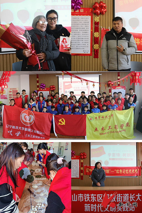 在铁东区长大社区,由辽科大的优秀校友、振峰公益团队发起人朱振峰主持本次活动。活动邀请雷锋生前工友易秀珍老人为现场的师生党员们上题为《学雷锋 树新风》的党课,分享雷锋为水泥遮雨献出棉被的感人故事。“如果你是一滴水,你是否滋润了一寸土地?如果你是一线阳光,你是否照亮了一分黑暗……”学院大学生理论宣讲团成员宋思宇声情并茂地讲述了《雷锋日记》中的选段,介绍了雷锋同志生平事迹,阐述了新时代雷锋精神的内涵。师生志愿者们为小朋友们包饺子,当一盘盘热气腾腾的饺子端到孩子们面前时,孩子们的一张张笑脸便是对志愿者热心服务最好的鼓励。最后,在场人员合唱《学习雷锋好榜样》,将现场气氛推向高潮。