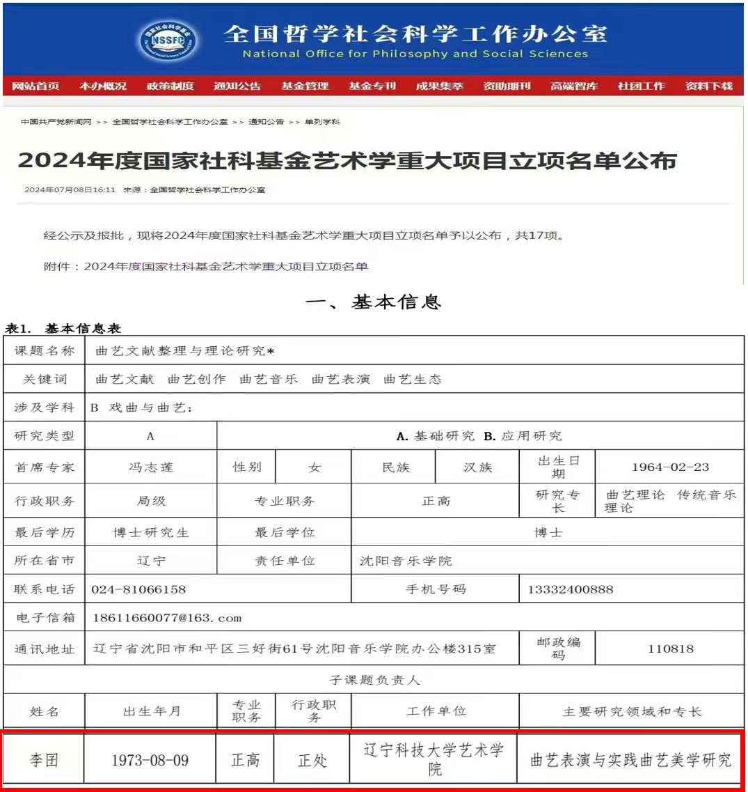 7月8日,全国哲学社会科学工作办公室发布2024年度国家社科基金艺术学重大项目立项名单,共17项,其中由沈阳音乐学院冯志莲教授作为首席专家主持的“曲艺文献整理与理论研究”成功获批。安博官网线上平台艺术学院李囝教授作为该项目子课题的负责人带领学院曲艺专业团队承担“曲艺生态与场域研究”课题研究,为项目的成功落地提供了极为有力的支撑。
