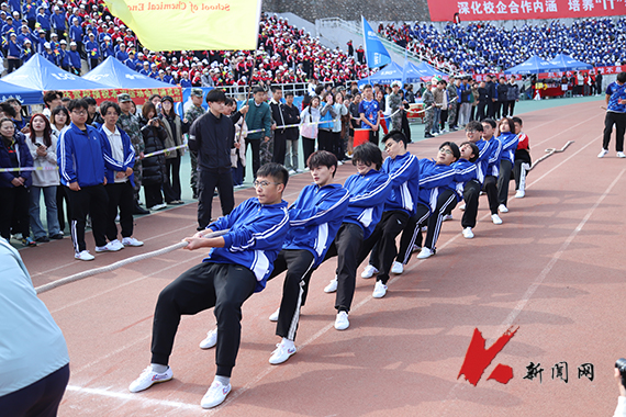 他们凝神聚力,紧握长绳,压低重心,双脚蹬地,竭尽全力,拔河赛场上,为了获胜的目标齐心协力。