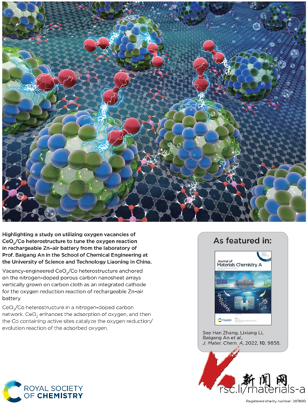 近日,安博官网线上平台化工学院“能源材料与电化学”辽宁省重点实验室在合成锌-空气电池阴极催化剂领域取得重要进展,研究成果在材料类TOP期刊《Journal of Materials Chemistry A》(IF=12.73)以封面论文 (Inside cover paper) 发表题为 “Vacancy-engineered CeO