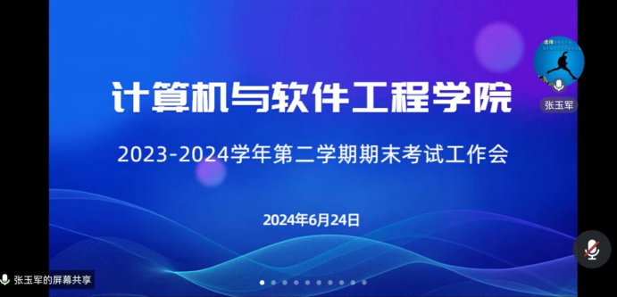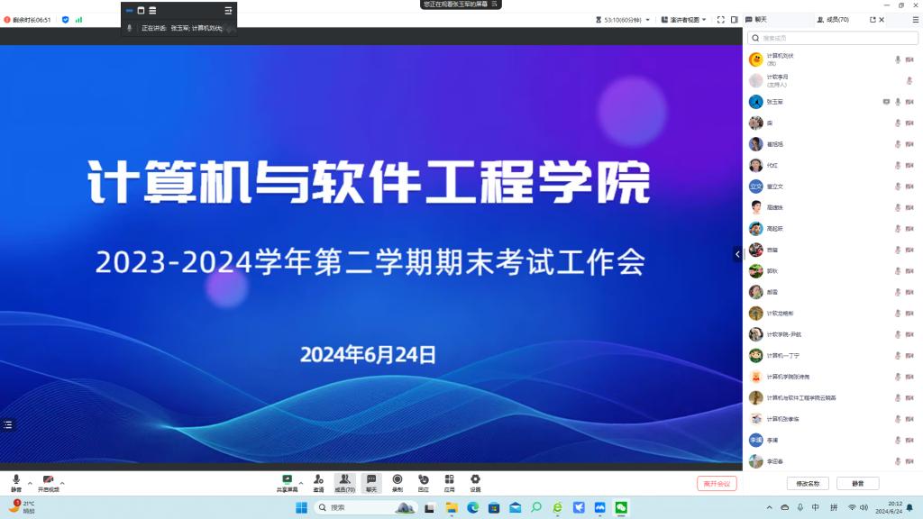 2024年6月24日晚,学院召开2023-2024学年第二学期期末考试工作线上会议,会议由教学副院长张玉军主持,学院领导班子成员及专任教师、综办及学办相关工作人员参会。