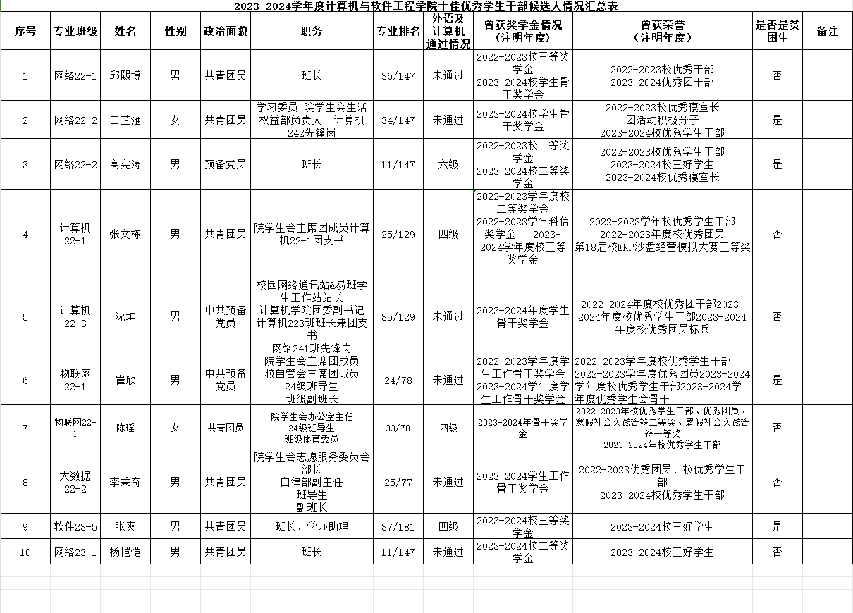 2023-2024学年度计算机与软件工程学院十佳优秀学生干部候选人公示