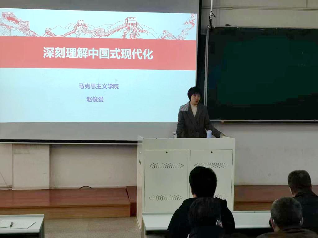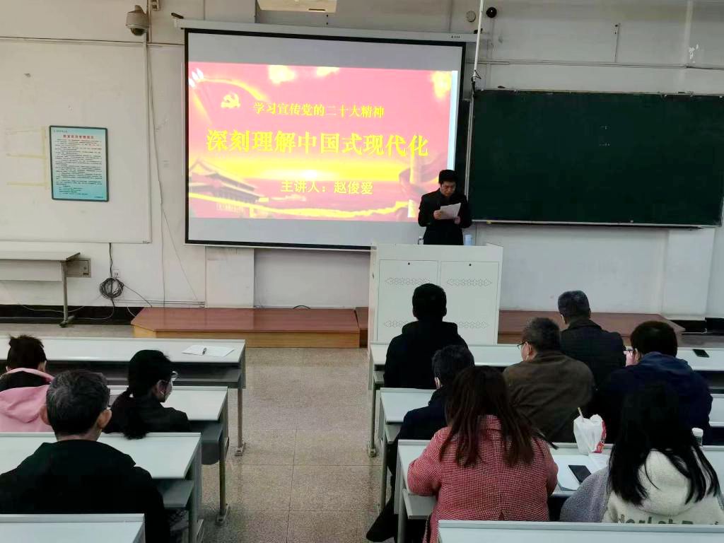 此次宣讲会由计算机学院党委书记陶润成主持,邀请马克思主义学院赵俊爱老师作了题目为《深刻理解中国式现代化》的党的二十大精神报告。赵俊爱老师分别从“历史视角---中国式现代化在中国的历程,理论视角---中国式现代化是什么,干什么和实践视角---中国式现代化怎么干”三个方面阐述了党的二十大精神中的以中国式现代化全面推进中华民族的伟大复兴。报告条理清晰、逻辑论证严密。对我们进一步学习贯彻党的二十大精神,正确理解和全面把握中国式现代化理论提供参考。