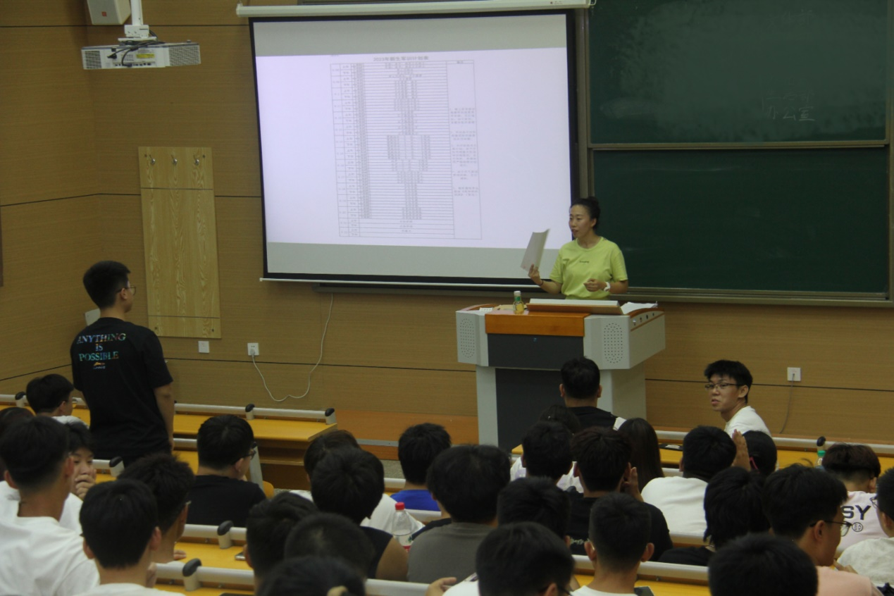 辅导员张翀睿明确军训时间安排和请假等相关事宜,就军训期间作息时间安排以及军训中应注意的问题着重进行了强调,并提出三点要求:第一、端正态度,认真对待军训,刻苦训练;第二、严守纪律,听从管理指挥,学习军人优良作风;第三、树立安全意识,确保军训期间的人身安全。