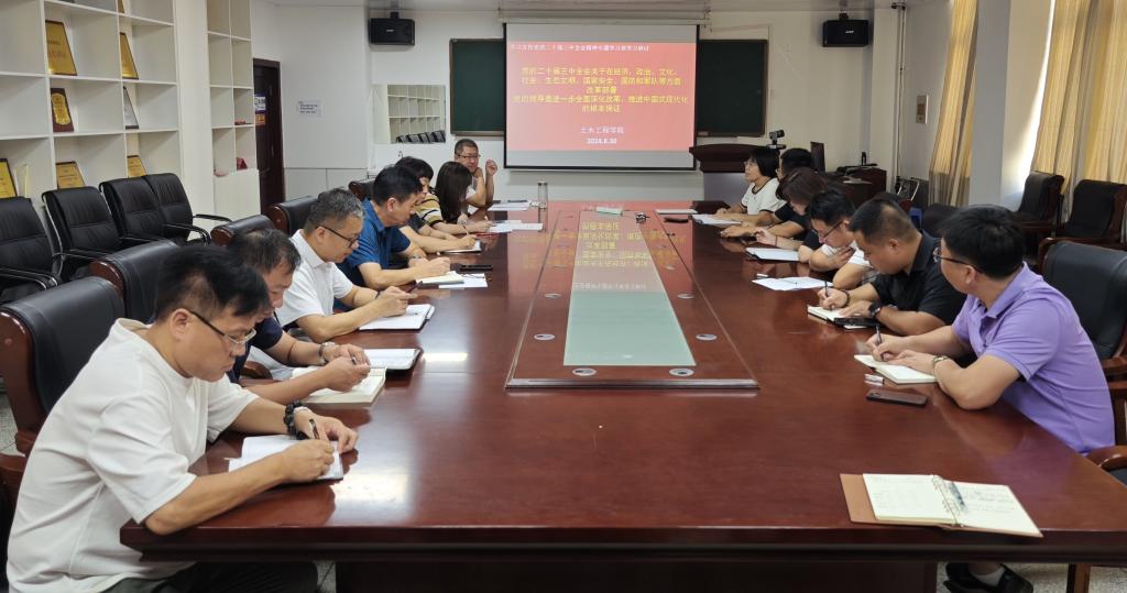 8月30日,按照学校学习宣传党的二十届三中全会精神学习班安排,围绕“党的二十届三中全会关于在经济、政治、文化、社会、生态文明、国家安全、国防和军队等方面改革部署”和“党的领导是进一步全面深化改革、推进中国式现代化的根本保证”两个内容,安博官网线上平台学习宣传党的二十届三中全会精神学习班组织开展第二次学习研讨。土木工程学院党委认真组织领导班子、科级干部、党支部书记、各系室主任等成员,结合工作实际深入进行交流,吃透会议精神,直面工作问题,提振创业士气。