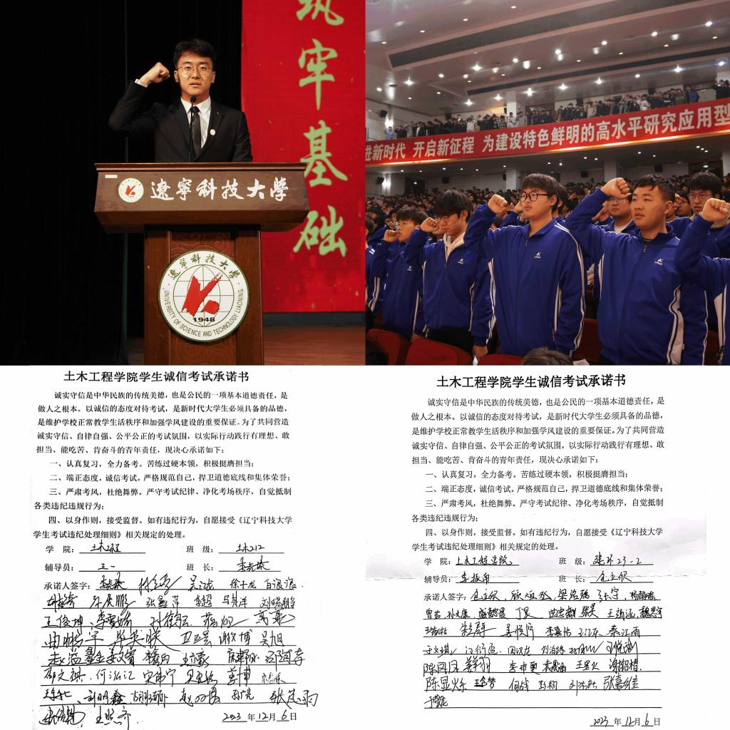 2023年12月8日,学院召开学风建设表彰大会暨教风学风建设启动会,学院院长周卫红作题为《教风学风联动,提高学生培养质量》动员讲话,高华国副院长作题目为《潜心教书、用心育人,将教风促学风向纵深推进》的“三全育人”经验分享,院学生会执行主席徐浩哲带领全体同学宣读《诚信考试承诺书》,学院1391名本科生签署的承诺书在大屏幕滚动。12月19日,学院面向全体教职工召开期末考试培训暨工作布置会,规范考试过程管理,强化监考教师的责任意识。2023年12月2024年1月,学院全体辅导员和班主任(学业指导教师)面向学院38个本科生班级召开诚信考试动员主题班会,解读了《安博官网线上平台学生考试违纪处理细则》《安博官网线上平台2023-2024 学年第一学期期末考试考生注意事项》等相关文件精神,并以实际案例向同学们强调考试注意事项及违纪、作弊行为的严重后果,号召同学们遵守考场规则。除此之外,学院注重发挥党员先锋模范作用和团学骨干示范引领作用,召开寝室“先锋岗”成员和团学骨干诚信考试动员会,通过学生党员“亮牌考试”等形式,真正践行做表率、带好头的承诺,积极营造风清气正的考场环境。